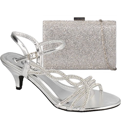 If you want to buy Ladies Silver Diamante Low Mid Kitten Heels Ankle Strap Shoes Sandals with matching Handbag (UK7 / EU40, Silver) safely and comfortably please click on the button below: