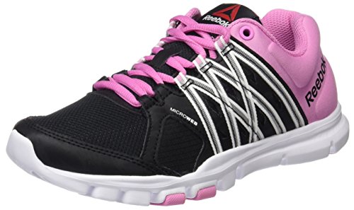 Womens Reebok Yourflex Trainette Trainers in black pink.- Micro Web lace-up closure.- Padded ankle collar and tongue.- MemoryTech insole for cushioning comfort. - Stabiliser heel.- Reebok branding.- Textile and mesh upper. Textile lining. Rubber sole.- Ref: AQ9452